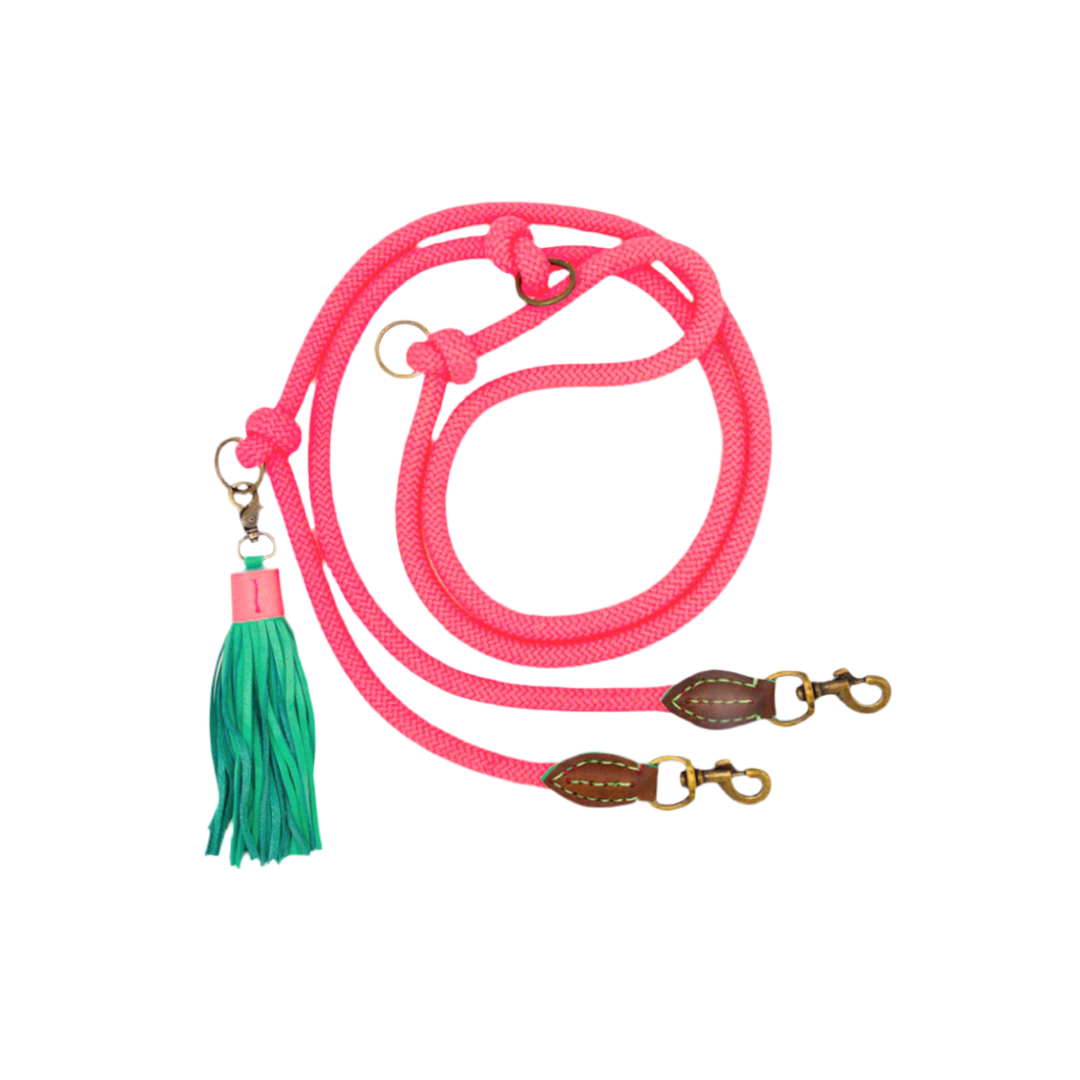 Diese coole Leine, Modell “Sugarbabe, Extra Lang” aus gewebtem Nylon in Neon-Pink und Lederapplikationen ist der perfekte Partner für deine Summer-Mood. Die Sugarbabe fällt ins Auge und genau das ist der Punkt! Das Pink leuchtet wunderschön, die türkisfarbene Ledertroddel ist ein absoluter Hingucker. Das Nylon ist dick und sehr soft und liegt angenehm in der Hand, auch wenn dein Hund mal ziehen sollte. Mit einer Länge von 220cm und 3 Ringen, hast du unterschiedliche Längen (140/180/220 cm) zum Gassigehen und kannst du die Leine auch entspannt crossbody um die Schulter legen, wenn dein Hund nicht angeleint ist.