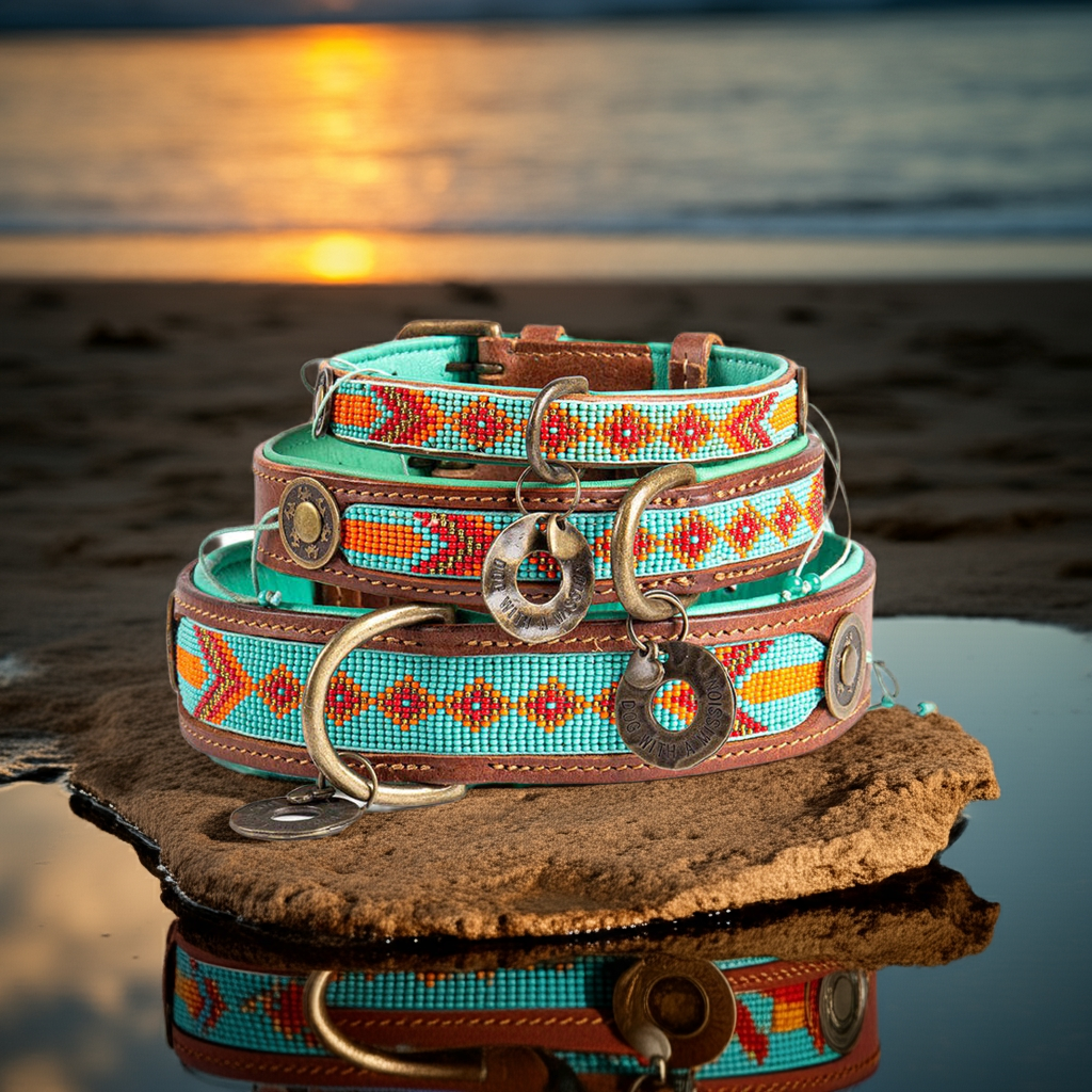Unser Hundehalsband "Paddy Lee" von Dog with a Mission ist mehr als ein modischer Ethno-Blickfang. Das Perlenmuster in sommerlichen Farben im Ethno-Look wurde von Hand geknüpft. Damit du und dein Hund davon lange etwas haben, auch wenn es beim Spielen etwas wilder hergeht, wurden die Perlen direkt ins/aufs Leder eingenäht. Das Paddy Lee aus der Beads Kollektion ist ein wunderschönes, braunes Lederhalsband mit handgefertigten Details, veredelt mit farbigen Perlen in unserem eigenen Design. Das Paddy Lee ist wirklich “one-of-a-kind”.