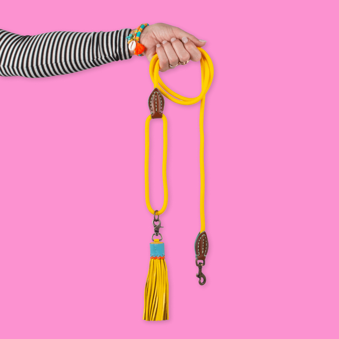 Diese sonnengelbe Statement Hundeleine mit einem schönen dekorativen Leder-Tassle verleiht dir gute Laune - egal ob an sonnigen oder verregneten Tagen. Die bequeme Handschlaufe liegt gut in der Hand, und für den Fall dass dein Hund mal freiläuft, kannst du die Leine entspannt um den Hals tragen.