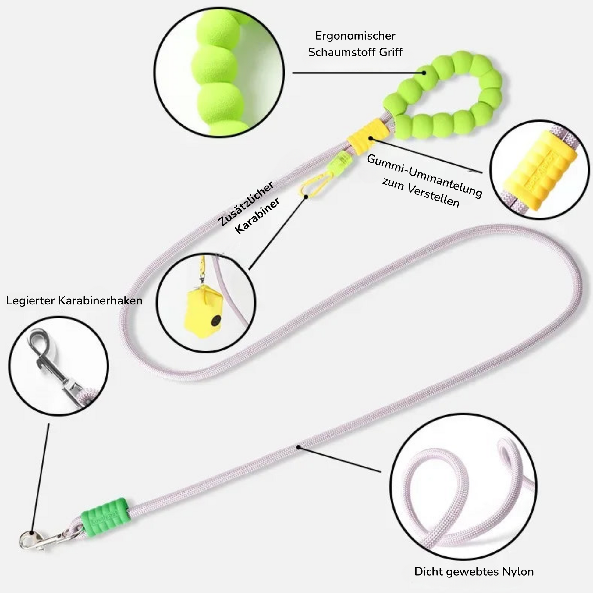 Entdecke unsere farbenfrohe Hundeleine für Spaziergänge mit Wow-Faktor! Mit gepolstertem Griff für deine Handgelenke und als Crossbody-Leine tragbar, damit du die Hände frei hast. Der praktische Extra-Karabiner hält Kotbeutel oder Schlüssel griffbereit. In drei sommerlichen Pastell/Neonfarben erhältlich, 180 cm lang und aus robustem High-Density-Nylon – für Abenteuer, die genauso strahlend sind wie dein Vierbeiner!