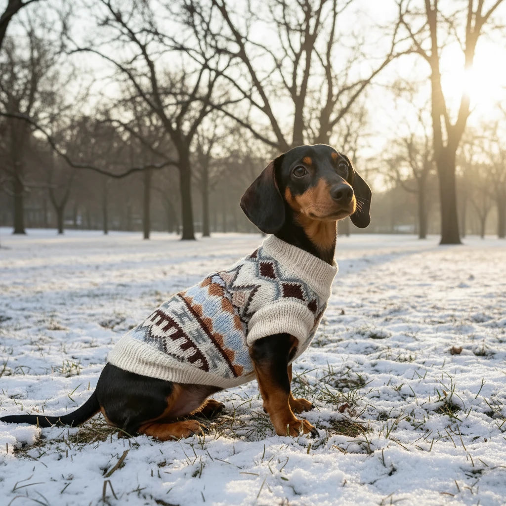 Unser kuscheliger Norweger Dackel-Pullover "Narwik" ist die perfekte Wahl für deinen vierbeinigen Freund! Mit seinem klassischen skandinavischen Muster styled dieser Pullover deinen Dackel ganz in nordischem Flair. Die hochwertige Baumwolle sorgt für wohlige Wärme an kühlen Tagen, während die durchdachte Passform deinem Dackel maximalen Komfort bietet. Ob beim Spaziergang durch die Herbstlandschaft oder beim gemütlichen Abhängen zu Hause – dieser charmante Pullover ist ein echter Hingucker. Dein Dackel wird zum Trendsetter im Hundepark.